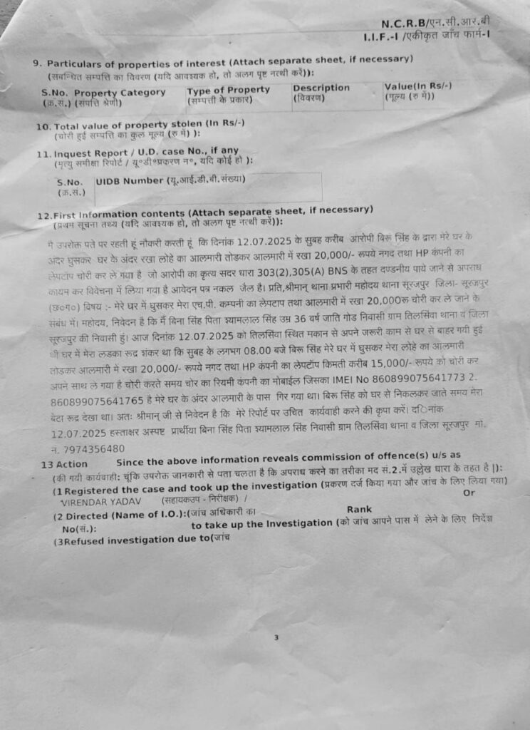 अलमारी में रखे 20,000 नकद और लैपटॉप लेकर फरार :- इसके बाद सुबह जब पुलिसकर्मी घर पर नहीं थी, उसी दौरान घर में सो रहे बच्चे को डरा-धमकाकर के घर के भीतर घुसकर अलमारी को तोड़ा और उसमें रखे करीब 20,000 नकद और एक लैपटॉप लेकर फरार हो गया,चोरी करते समय चोर का रियलमी कंपनी का मोबाइल आलमारी के पास गिर गया था। जिसे पुलिस वालों ने जप्ती कर लिया है। महिला पुलिसकर्मी ने थाने में शिकायत कर बताया कि बीती रात भी वही संदिग्ध युवक उनके घर के सामने आकर जमकर गाली-गलौज कर तोड़फोड़ कर रहा था और सुबह घर में चोरी की वारदात को अंजाम दे दिया।