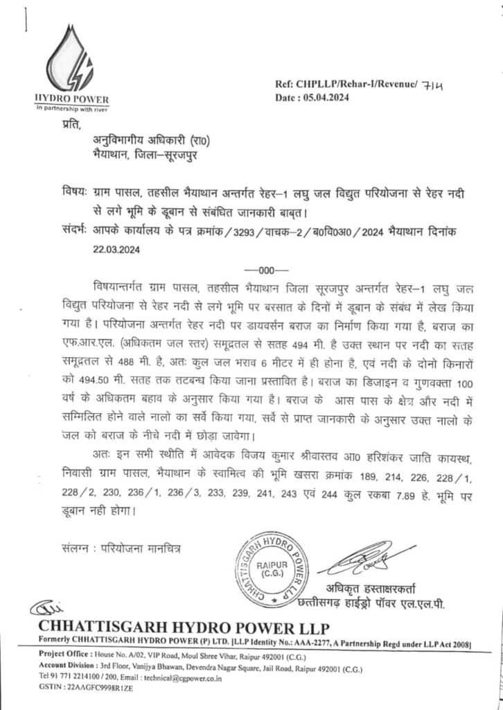 एसडीओ पहुंचे स्थल पर कंपनी नहीं दिखा सकी दस्तावेज :- जल संसाधन विभाग सूरजपुर के एसडीओ लोकेश पटेल ने हाइड्रो प्रोजेक्ट स्थल का निरीक्षण किया। उन्होंने हाइड्रो पावर के अधिकारी संतोष सिंह से डायवर्जन और बांध की ड्राइंग डिज़ाइन की मांग की, परंतु कंपनी ने बताया कि दस्तावेज रायपुर में हैं। ऐसे में तकनीकी जांच अधूरी रह गई।