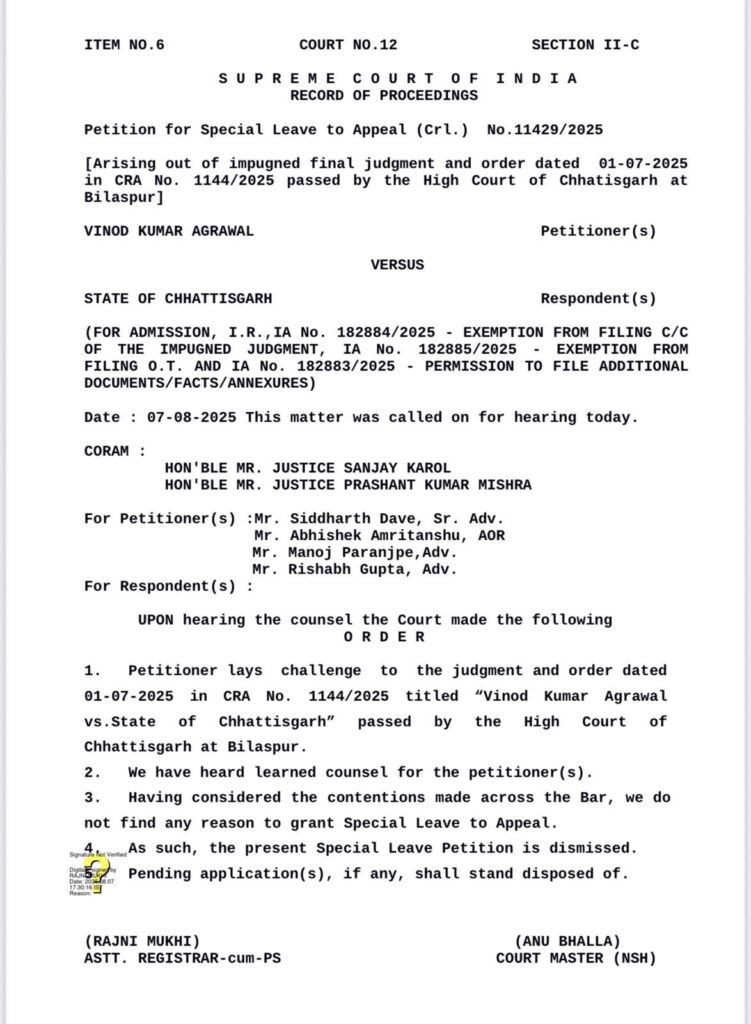 हाई कोर्ट: 1 जुलाई 2025 को छत्तीसगढ़ हाई कोर्ट, बिलासपुर ने स्पष्ट कहा कि निचली अदालत का फैसला सही है और अग्रवाल को कोई विशेष राहत देने का आधार नहीं है।