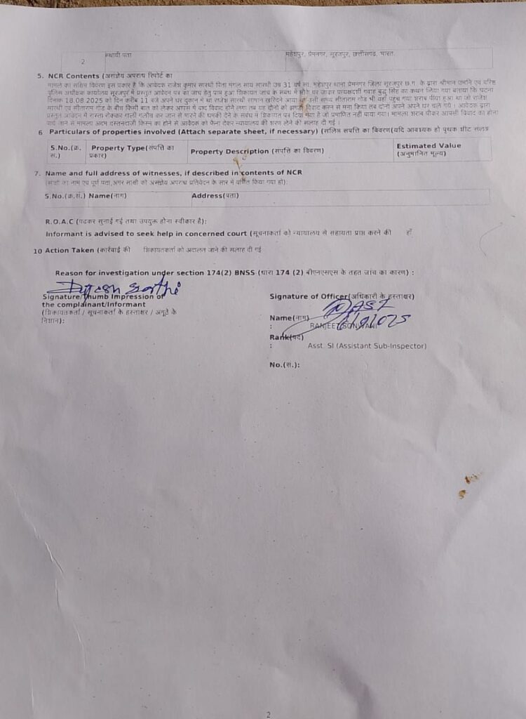 प्रेमनगर पुलिस ने भारतीय नागरिक सुरक्षा संहिता (बीएनएसएस) 2023 की धारा 174 के तहत अपराध पंजीबद्ध किया है ।