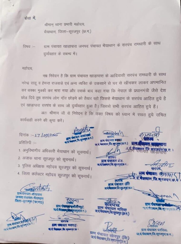 सूरजपुर :- जिले के विकासखंण्ड भैयाथान अंर्तगत ग्राम पंचायत खाड़ापारा के सरपंच रामधारी के साथ सोमवार को हुए मारपीट एवं दुर्व्यवहार की घटना ने क्षेत्र के जनप्रतिनिधियों में रोष फैला दिया है। इसी कड़ी में बीते बुधवार को दजर्नो सरपंच एकजुट होकर पहले झिलमिली भैयाथान थाना पहुंच कर ज्ञापन सौपा इसकी प्रतिलिपि अनुविभागीय अधिकारी भैयाथान , अजाक थाना सूरजपुर , कलेक्टर सूरजपुर , पुलिस अधीक्षक को ज्ञापन सौंपते हुए आरोपियों के विरुद्ध कड़ी कार्रवाई करने की मांग की। ज्ञापन में सरपंचों ने बताया कि बीते दिनों सरपंच रामधारी को नरेन्द्र साहू, हेमंत राजवाड़े सहित अन्य लोगों ने घर से खींचकर सार्वजनिक रूप से अपमानित किया।