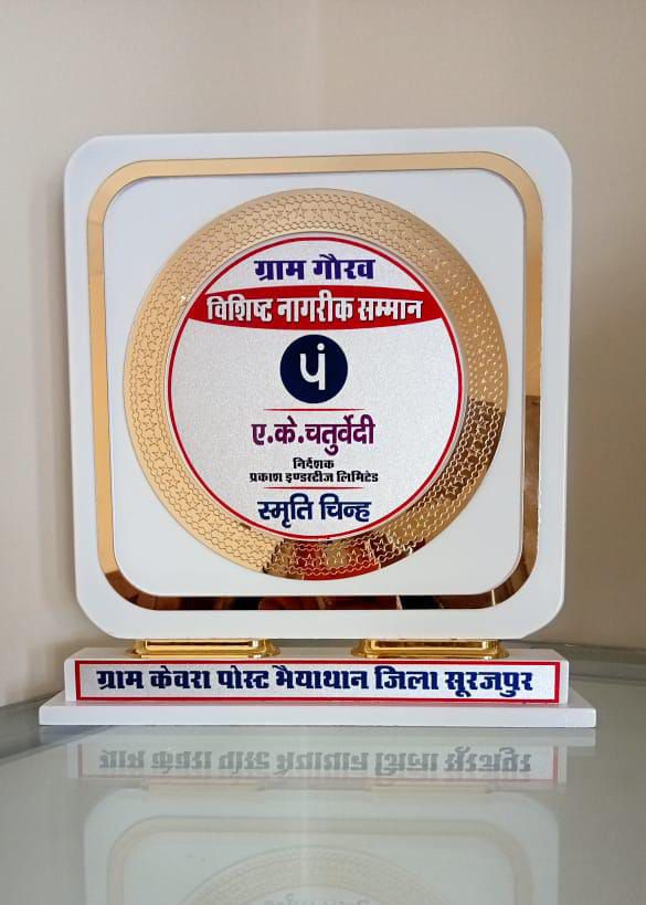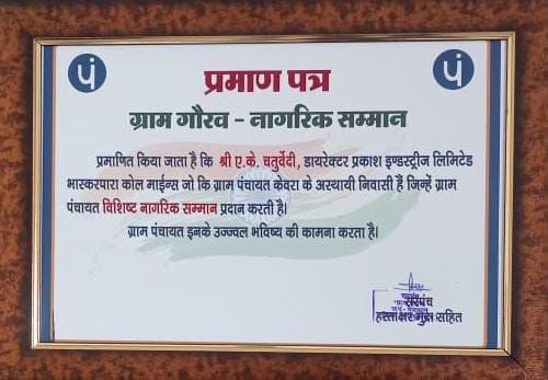 सूरजपुर :- जिले के भैयाथान विकासखंड अंतर्गत ग्राम पंचायत केवरा के सती चौक पर शारदीय नवरात्र के अवसर पर चल रहे देवी कथा के बिच बीते देर शाम प्रकाश इंडस्ट्रीज के निर्देशक ए.के. चतुर्वेदी पहुंचे जहां दुर्गा पूजा समिति के सदस्यों व उपस्थित जनप्रतिनिधियों ने उनका जोरदार स्वागत किया वहीं दुर्गा पूजा समिति के पदाधिकारी – सदस्य व ग्रामवासियों ने ग्राम गौरव विशिष्ट नागरिक सम्मान पत्र और स्मृति चिन्ह से प्रकाश इंडस्ट्रीज लिमिटेड के निर्देशक को नवाजा है ।