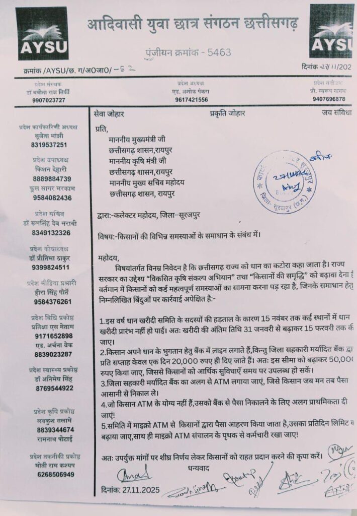 इस ज्ञापन को सौंपने के दौरान आदिवासी युवा छात्र संगठन छत्तीसगढ़ के प्रदेश अध्यक्ष अशोक पैकरा,संभाग संरक्षक कृष्णा नारायण चेरवा,संभाग उपाध्यक्ष जगदीश सिंह, जिला अध्यक्ष आनंद सिंह मरकाम,सदस्य गौरीशंकर सिंह,सामाजिक कार्यकर्ता चिंटू सोनवानी,संदीप कुशवाहा,वीरेंद्र कुशवाहा, सुरेश सिंह,कमलकांत सिंह, राजेंद्र पैकरा, मनीष,धनी एवं आलोक सिंह उपस्थित रहे।