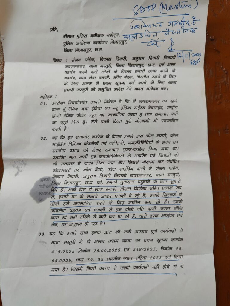 जयरामनगर निवासी डी.पी. गोस्वामी, जो दैनिक नया इंडिया, न्यू इंडिया टाइम्स वेबसाइट एवं एक राष्ट्रीय हिंदी दैनिक पोर्टल के ब्यूरो चीफ हैं, तथा उनकी धर्मपत्नी दिव्या पुरी गोस्वामी (पत्रकार) ने इस संबंध में थाना मस्तूरी में नामजद शिकायत दर्ज कराई है। शिकायत के अनुसार, आरोपियों संजय पांडेय, विकास तिवारी और अनुराग तिवारी (निवासी जयरामनगर, थाना मस्तूरी, जिला बिलासपुर) ने कोयला कारोबार से जुड़े समाचारों के प्रकाशन से क्षुब्ध होकर पत्रकार दम्पत्ति को नुकसान पहुंचाने की सुपारी ली और लगातार धमकियां दे रहे हैं।