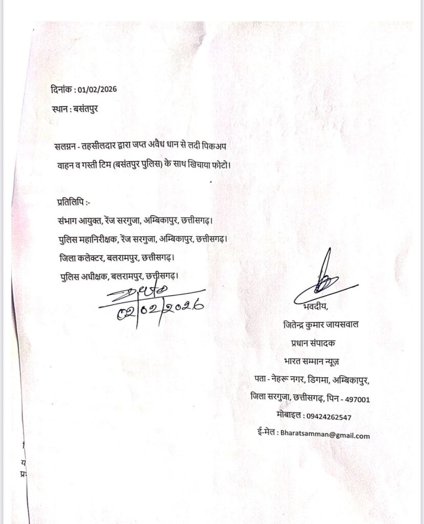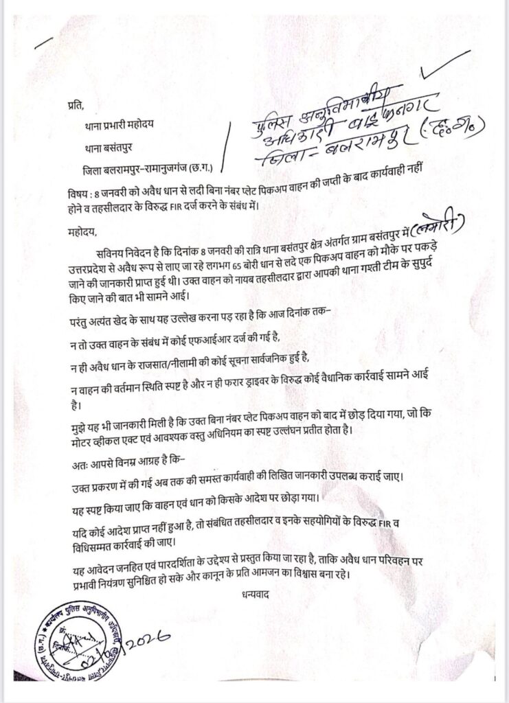 इस शिकायत की प्रतिलिपि संभाग आयुक्त (सरगुजा), आईजी (सरगुजा रेंज), जिला कलेक्टर और पुलिस अधीक्षक (बलरामपुर) को भी भेजी गई है, ताकि इस कथित ‘सिस्टम की सेटिंग’ की उच्च स्तरीय जांच हो सके।