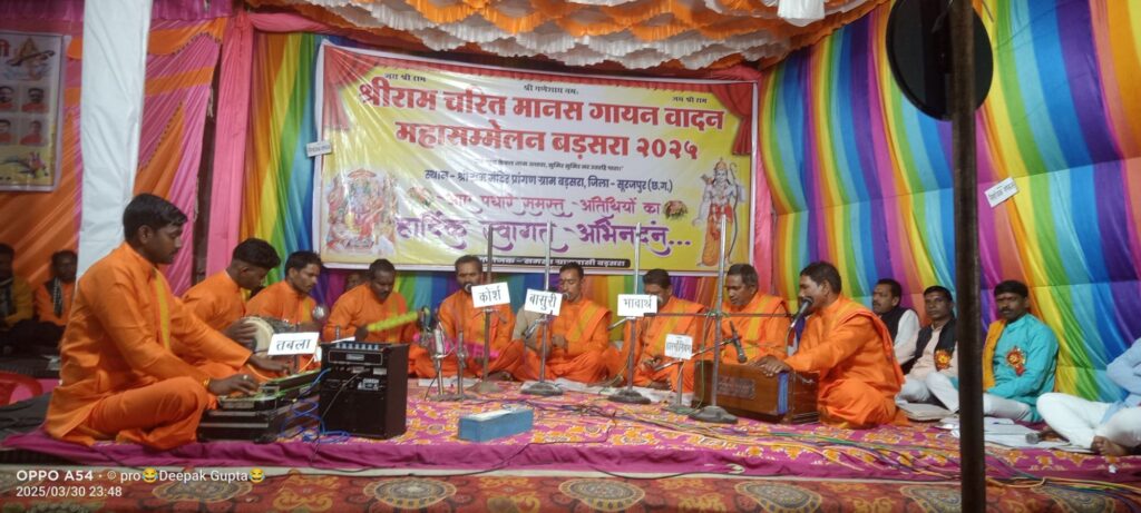 सूरजपुर :- जिले के भैयाथान विकासखंड अंतर्गत ग्राम पंचायत बड़सरा के श्री राम मंदिर प्रांगण मे 30 मार्च दिन रविवार से शुरु हुऐ श्री राम रामचरित मानस गायनवादन महासम्मेलन के प्रारंभिक दिवस को 31 मानस मंडली अपनी प्रस्तुति देंगे । जिसमे