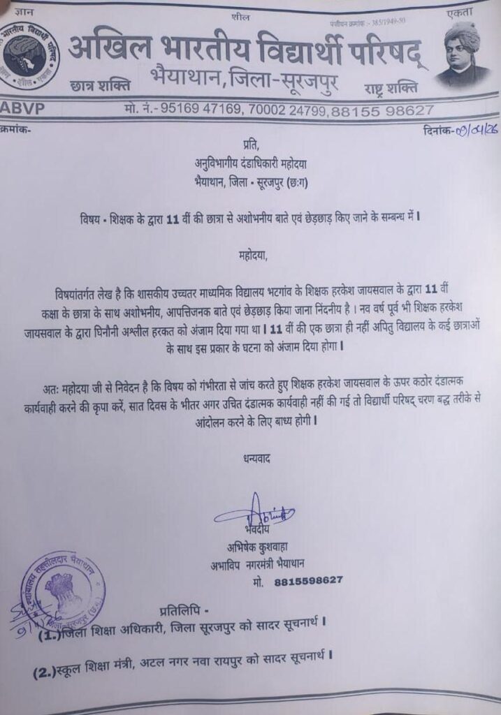 इधर अखिल भारतीय विद्यार्थी परिषद के पदाधिकारियों ने इस घटना कड़ी निंदा करते हुऐ भैयाथान एसडीएम के नाम तहसीलदार को एक लिखित शिकायत पत्र सौपा है । इस संबंध मे छात्र नेता पराशर दुबे ने बताया कि अभाविप के भैयाथान के नगर महामंत्री अभिषेक कुशवाहा के नेतृत्व में इस घटना की लिखित शिकायत एसडीएम से कर आरोपी शिक्षक के विरुद्ध कड़ी कर्रवाई करने की मांग की गई है ।