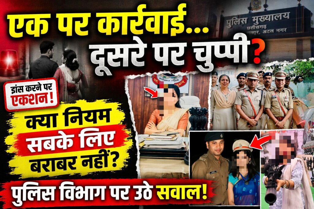 रायपुर / बिलासपुर :- छत्तीसगढ़ में पुलिस विभाग से जुड़े आचरण और अनुशासन को लेकर एक बार फिर बहस तेज हो गई है। हाल ही में बिलासपुर में एक आरक्षक पर अपनी पत्नी के साथ डांस करने का वीडियो वायरल होने के बाद विभागीय कार्रवाई की गई थी। इस कार्रवाई को लेकर पहले ही सवाल उठ रहे थे कि क्या यह निर्णय अत्यधिक कठोर था या नियमों के अनुरूप।