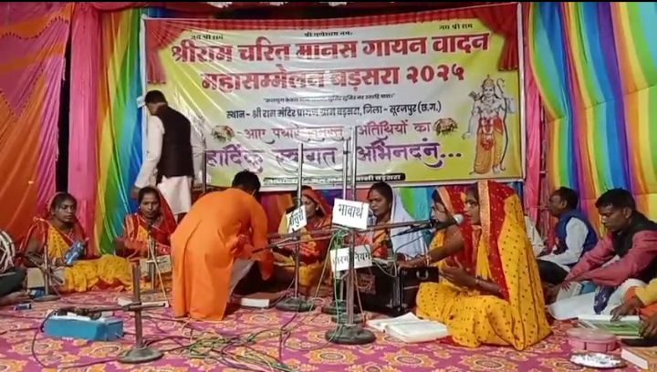 सूरजपुर :- श्रीराम जन्मोत्सव व हिंदू नववर्ष के अवसर पर झंडा वाला श्रीराम चरित मानस गायन वादन सम्मेलन का आयोजन विकासखंड भैयाथान के बड़सरा स्थित श्री राम मंदिर प्रांगण में बीते 31 मार्च रविवार से प्रारंभ हुआ है यह तीन दिनों तक चलेगा। इस सम्मेलन में शामिल होने 91 मंडलियों ने पंजीयन कराया है। श्रीरामचरित मानस गायन, वादन सम्मेलन का शुभारंभ सोनू जायसवाल, रामू गोस्वामी, रामाशंकर यादव, जगनारायण सिंह सरपंच, सुशील साहू एवं झंडा वाला समिति के केंद्रीय सदस्यों व आयोजन समिति के सदस्यों की उपस्थिति में दीप प्रज्वलित कर किया गया। चंदन, बैच व श्रीफल भेंटकर निर्णायक व अतिथियों का स्वागत किया गया।
