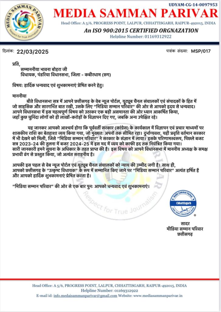 विधायक भावना बोहरा को धन्यवाद पत्र :- “मीडिया सम्मान परिवार” के सभी सदस्यों ने विधायक भावना बोहरा के इस साहसिक कदम का स्वागत किया और उनका आभार व्यक्त करने के लिए 22 मार्च 2025 को पत्र क्रमांक MSP/017 के माध्यम से आधिकारिक धन्यवाद पत्र भेजा। इस कदम से यह साफ हो गया कि डिजिटल पत्रकारिता को अब नजरअंदाज नहीं किया जा सकता और पत्रकारों की एकता सरकारी तंत्र में बदलाव लाने की ताकत रखती है।