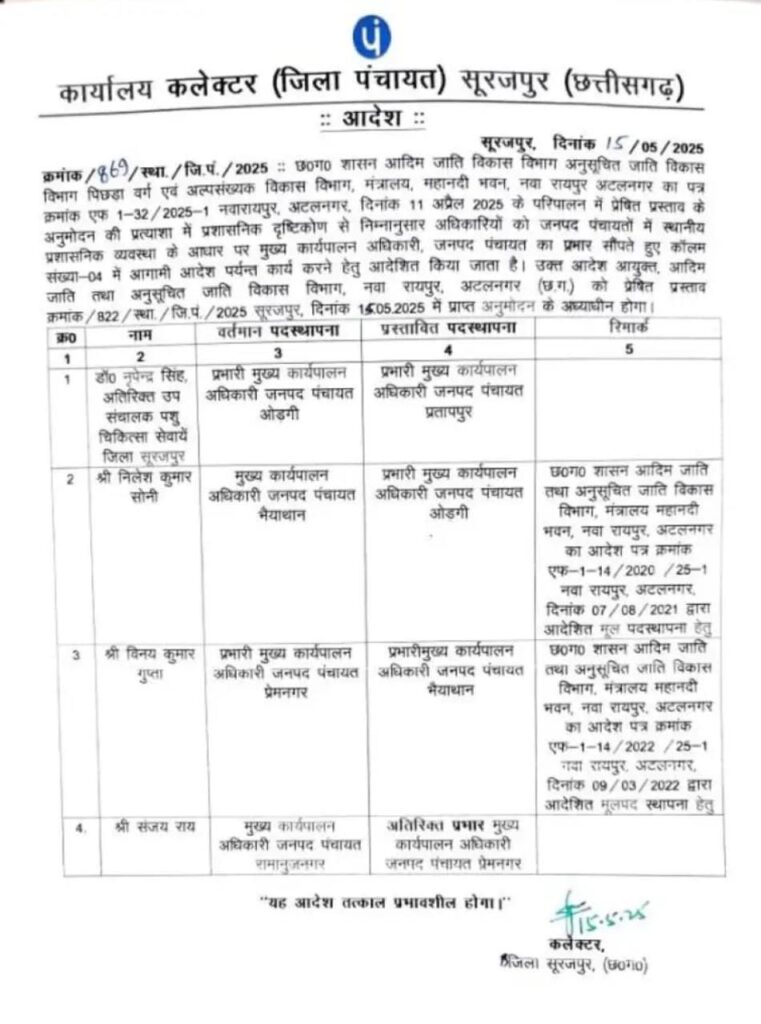 सूरजपुर :- जिले में प्रशासनिक व्यवस्था को और सुदृढ़ करने के उद्देश्य से चार जनपद पंचायतों के मुख्य कार्यपालन अधिकारियों के तबादले की सूची जारी की गई है। यह तबादला आदेश जिला प्रशासन द्वारा तत्काल प्रभाव से लागू किया गया है, जिसके तहत अधिकारियों को नई जिम्मेदारियां सौंपी गई हैं। उक्ताशय पर प्राप्त जानकारी अनुसार डॉ. नृपेन्द्र सिंह जो पहले जनपद पंचायत ओड़गी के प्रभारी मुख्य कार्यपालन अधिकारी थे, अब जनपद पंचायत प्रतापपुर की कमान संभालेंगे।