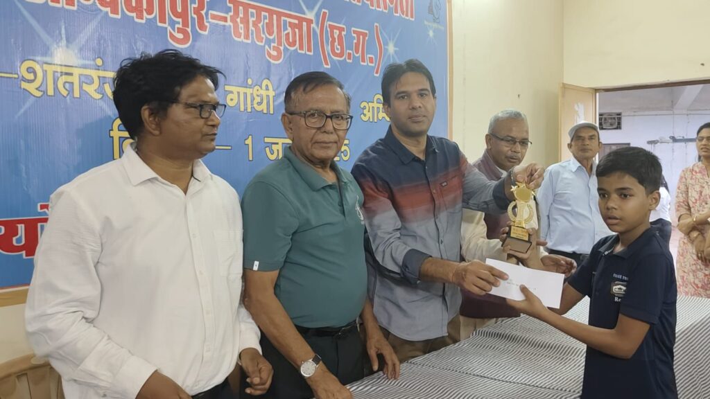 सूरजपुर / भैयाथान :- शतरंज संघ सरगुजा द्वारा आयोजित संभाग स्तरीय ओपन शतरंज प्रतियोगिता में सरगुजा संभाग के उभरते हुए प्रतिभाशाली खिलाड़ी निवेद जायसवाल ने उत्कृष्ट प्रदर्शन करते हुए द्वितीय स्थान प्राप्त कर क्षेत्र का मान बढ़ाया है। प्रतियोगिता में सरगुजा संभाग के विभिन्न जिलों से आए दर्जनों प्रतिभागियों के
